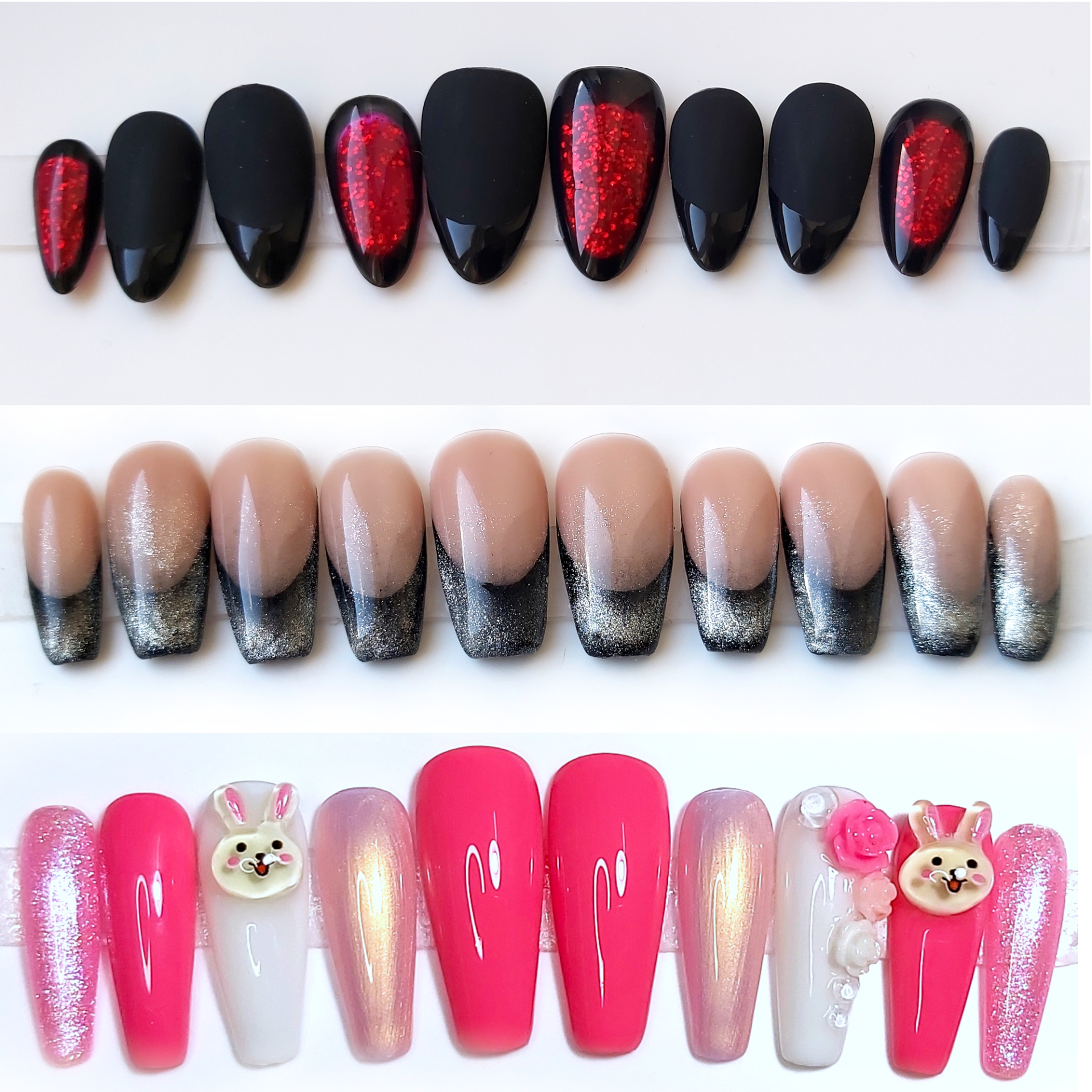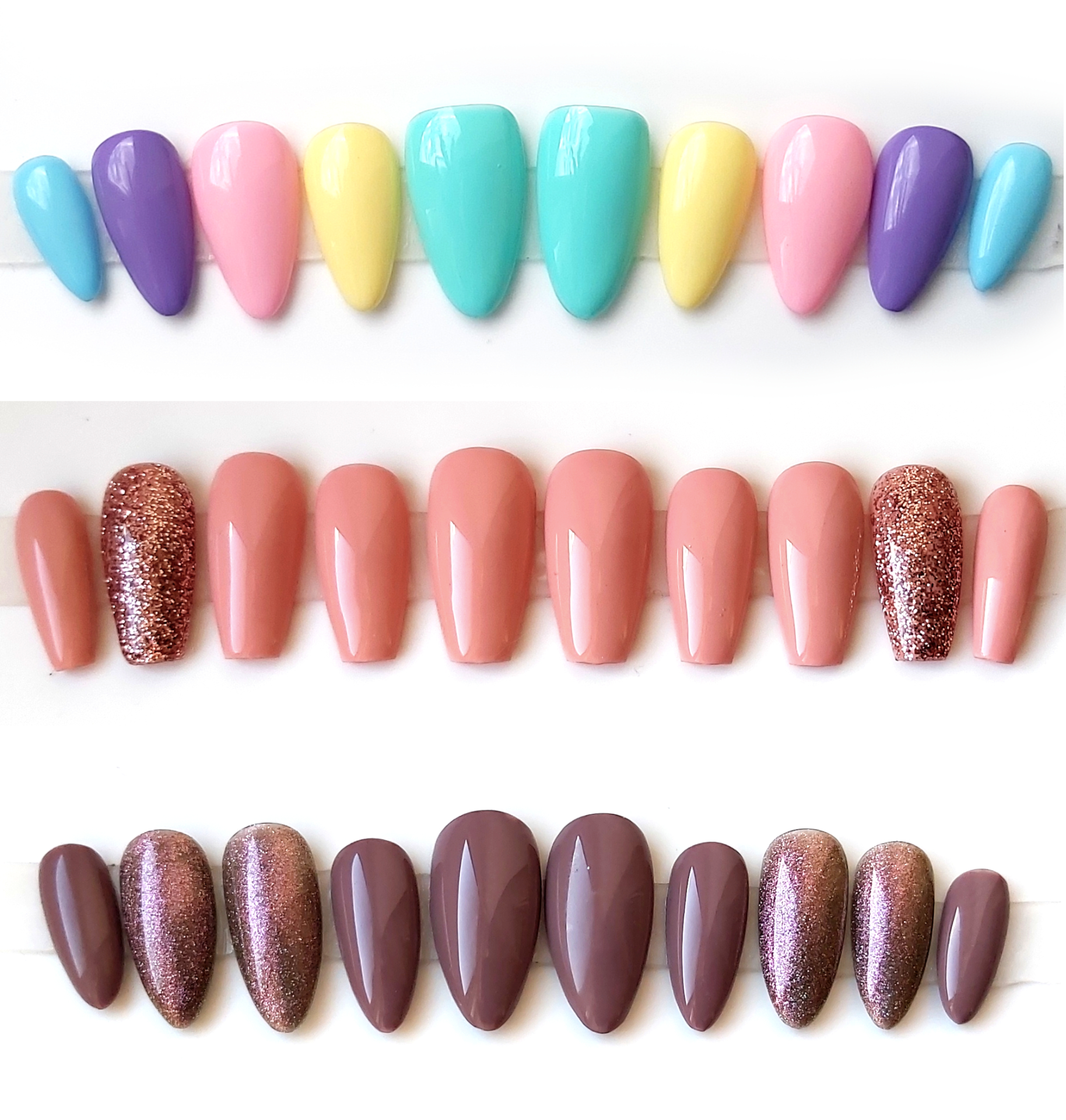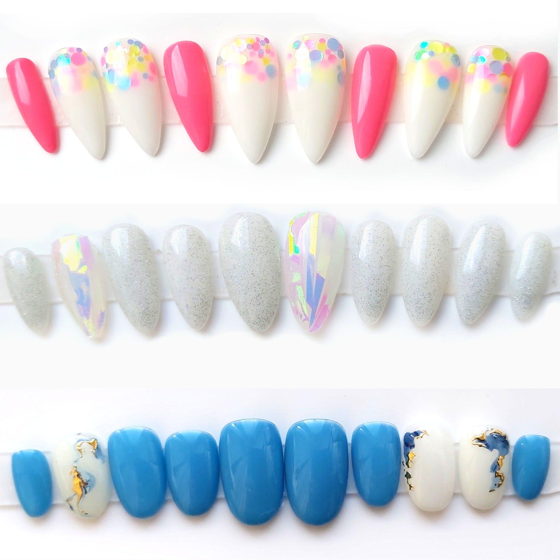 Jinak každý nehet ze setu může mít jinou barvu - hladkou nebo třpytivou.